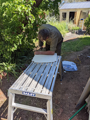 Got George and Justin to measure the jarrah/mahogany bits of wood that we plan to use for the island bench counter top. Should be enough, and some left over for the vanity top in the powder room. Needs to be sanded back a bit