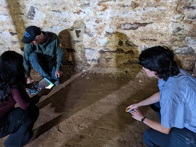 Tim had a type of trolley with a scanner suspended below - and this could be adjusted to show 30cm to 10 metres depth. Then there was a tablet on the handle above - which he read to see what the conditions were like below. Basically he was looking for ground disturbance