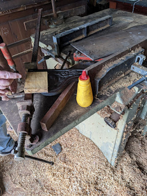 This piece from the top also had a dodgy "carving" on the end. Turns out it was just putty. Terry will put a new piece of wood on and do the carving