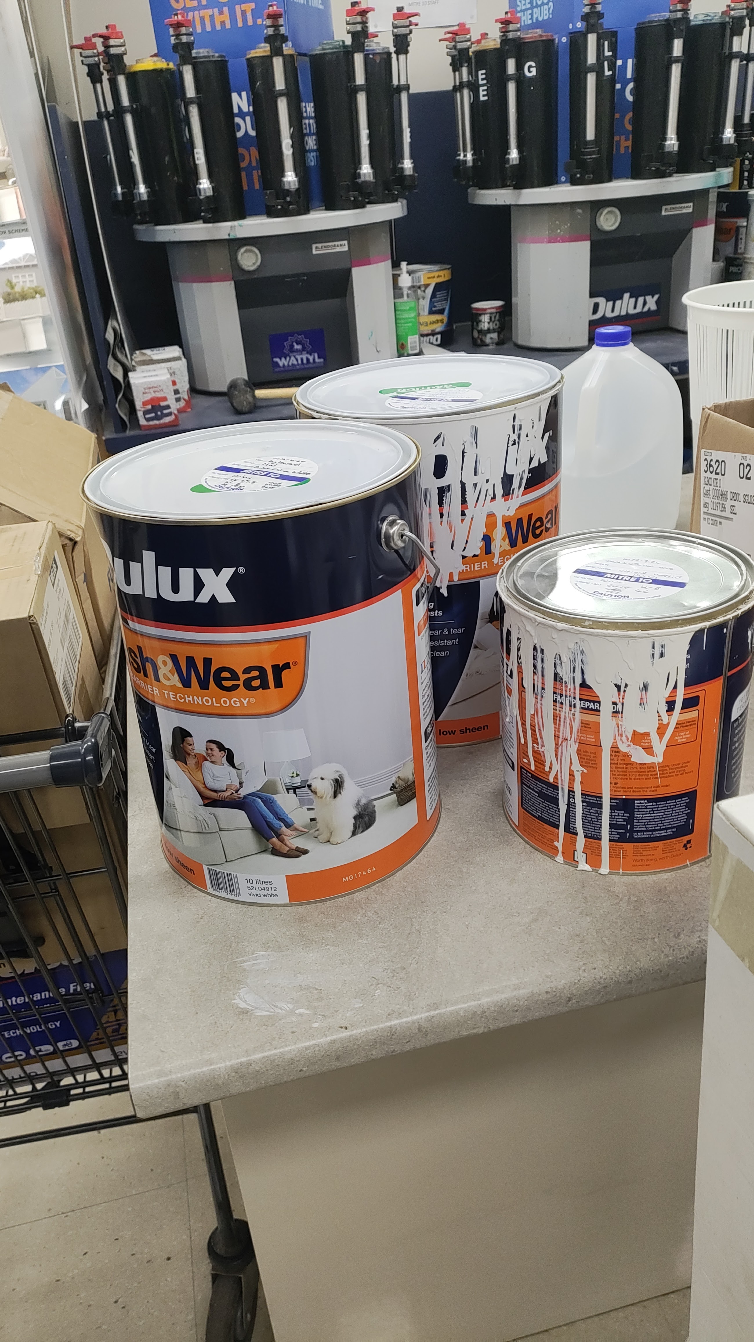 Friday - and I went up to IGA first thing - and brought the 10L supposedly wrong colour China White, the empty 4L supposedly right China White, and the stirring stick - which showed the very white colour from the 10L tine